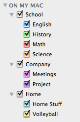 To get the most out of the way iCal works you can set up a calendar for each area that might make sense to see by itself. If you are a student or teacher, set up a calendar for each class and assign a different color to each of them. Set up calendar groups for school, home and work. The advantage of individual calendars and calendar groups comes when you only want to check certain calendars or certain groups. Just want to see events for school? Select your school calendar group and uncheck the rest. Here is a sample of calendar groups and calendars.