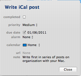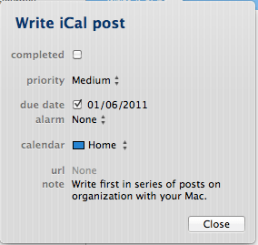 iCal is an application that many will find fully meets their needs for calendars and to do lists. If that’s you then your quest might be over. If you find iCal to be a good start but doesn’t totally meet your needs then continue on to the second post in my series on Organization with GTD.