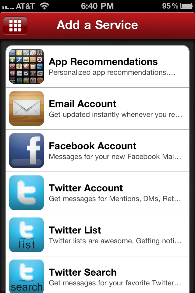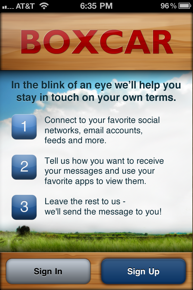 When you first start up the app, say yes to push notifications. You can sign up from your iOS device and get started. At the current time, Boxcar supports notifications for email accounts, Facebook, Twitter, Google Buzz, Google Voice, Foursquare, Gowalla, Reddit, any RSS feed, Github, OMGFacts, Growl, and App Recommendations. The list will continue to grow over time.